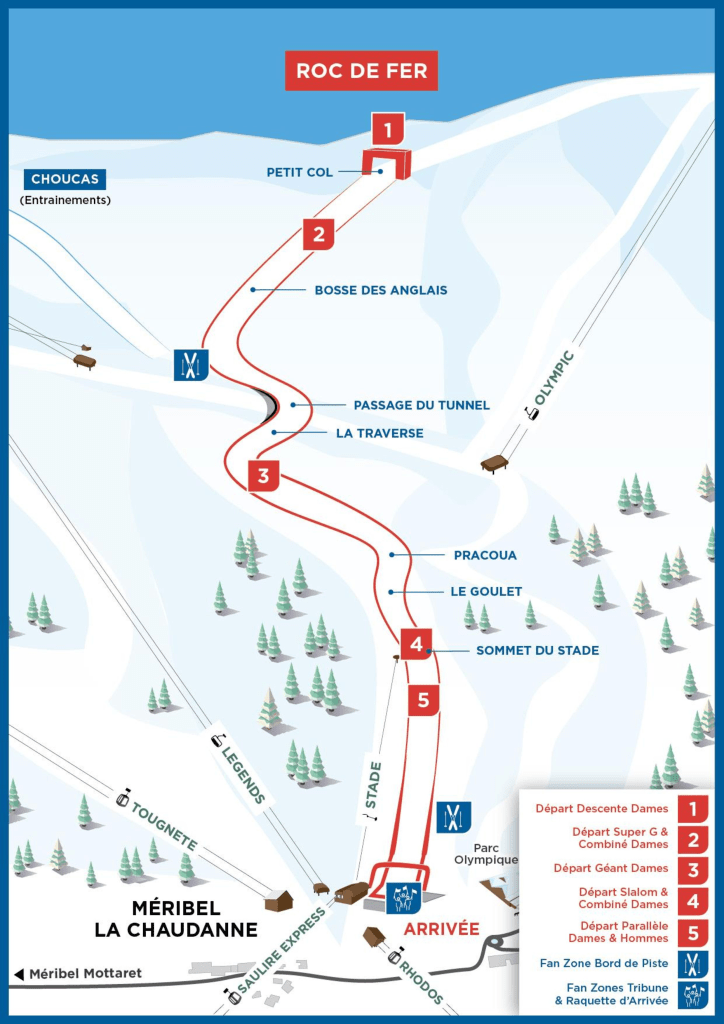 A női versenyek a patinás Roc de Fer, magyarul vasérc /vas szikla pályán kerülnek majd megrendezésre. A pálya adott otthont a ’92-es albertville-i olimpia női számainak is, valamint a 2015-ös világkupadöntőknek. A pálya egyébként a hobbisízők számára is nyitva áll, ha valaki vállalja a 2,5 kilométeres, 500 méteres ereszkedésű fekete pálya kihívásait.