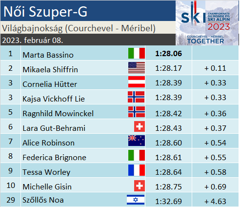 Szuperóriásban mindig kardinális kérdés a pálya jellege, nos, ezúttal a helyzetről mindent elárult, hogy a legjobb tíz között hat-hét óriás-műlesikló végzett. Marta Bassino részéről számos mértékadó lesiklást láthattunk már ahhoz, hogy ne essen le a padlóig az állunk mostani sikerétől, de mégis csak egy olyasvalakiről beszélünk, aki korábban sosem nyert gyors számban VK-versenyt. A kétszeres világbajnoknő mögött szoros csatában végzett Mikaela Shiffrin kiköszörülte a csorbát a hétfői balul sikerült kombinációs szlalom után. A dobogó harmadik lépcsőjén holtverseny alakult ki két elsőbálos, Cornelia Hütter és Kajsa Vickhoff Lie között. Szőllős Noa minden tehertől mentesen síelt egy jót, ez ma a 29. helyre volt elegendő.