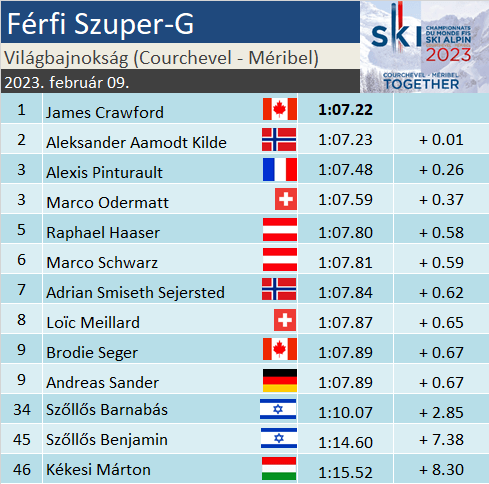 A világbajnokság eddig az enyhébb meglepetések vb-je. James Crawford ott szerepelt a szuperóriás bőven vett esélyeseinek a csoportjában, de annyira kiemelkedett a mezőnyből két-három vetélytársa, hogy az aranyérem nem igazán jött szóba. A kanadaiak legendásan extrán teljesítenek a vb-ken, ezúttal a szerencse is melléjük állt: egyetlenegy századdal előzte meg Aleksander Aamodt Kildét, a verseny egyik legfőbb esélyesét. A másik, Marco Odermatt a dobogóra sem állhatott fel, mivel bő egy tizeddel kikapott a felettébb fényes vb-t teljesítő Alexis Pinturault-tól. Bár érmet ma nem szereztek, tovább tart az osztrákok erős szereplése Courchevel-Méribelben. Raphael Haaser és Marco Schwarz révén ketten végeztek a TOP6 között. Szőllős Barnabás 3 másodperces hátránnyal a szép 34. helyen fejezte be a versenyt, míg Benjamin a 45., a magyar csapatból elsőként bemutatkozó Kékesi Márton a 46. helyen végzett.