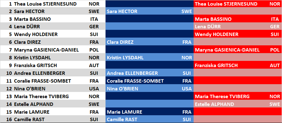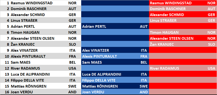 A visszavágók során az első párosban a meglepetés elmaradt: Stjernesund nem engedett teret Gasienuca-Danielnek. Tvibergnek nem volt könnyű dolga, de hatalmas bravúr volt, hogy épp Dürrt tudta maga mögött tartani egy rendkívül szoros meccsen. Lamure-ról a visszavágók után is csak szuperlatívuszokban írhattunk, miután utolsó állva maradt hazaiként (nemekre tekintet nélkül) sem remegett meg, és Gritschet is búcsúztatta. Ahogy említettük, Hectornak már papíron sem volt könnyű dolga a negyeddöntőben, Holdener pedig a visszavágóban sem hagyott teret a svédnek.