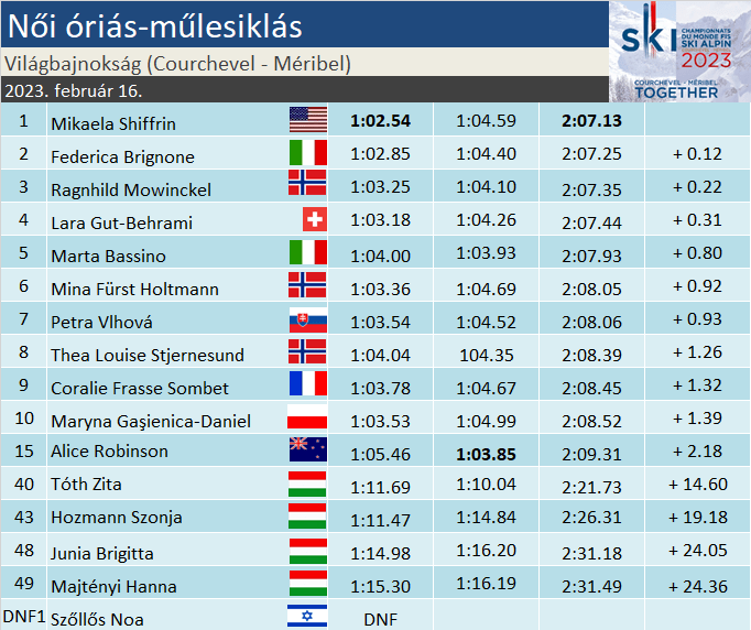A rajtlista másik fele még hátra volt, róluk még pár szóban. Miradoli – talán a Worleyval történtek láttán – indiszponáltan kezdett, nem ért célba, akárcsak kicsivel később Tilley, Luczak és Sola. Aicher (31.) igen, bár neki gyakorlatilag újra kellett indulnia a bukótérből, ezért Jelinková (29.) és Pykalainen (30.) is megelőzte. A magyar lányok közül Hozmann Szonja (43.) nagyjából ugyanolyan frekvenciával síelt, mint délelőtt, Tóth Zita (40.) viszont nyelt egy nagyot, és úgy volt vele, most bátran engedni fogja a léceit. Csak 5.45-t kapott Robinsontól délután, amivel kérdés nélkül visszavette a legjobb magyar címet. Junia Brigitta (48.) és Majtényi Hanna (49.) párharca késhegyre ment, délután Hanna volt gyorsabb egy századdal, összességében 31 század Brigi mellett döntött. Summa summarum, mind a négy magyar lány a TOP50-ben végzett a világbajnoki mezőnyben, ami azért komoly csapatteljesítmény. Csak így tovább szlalomban!