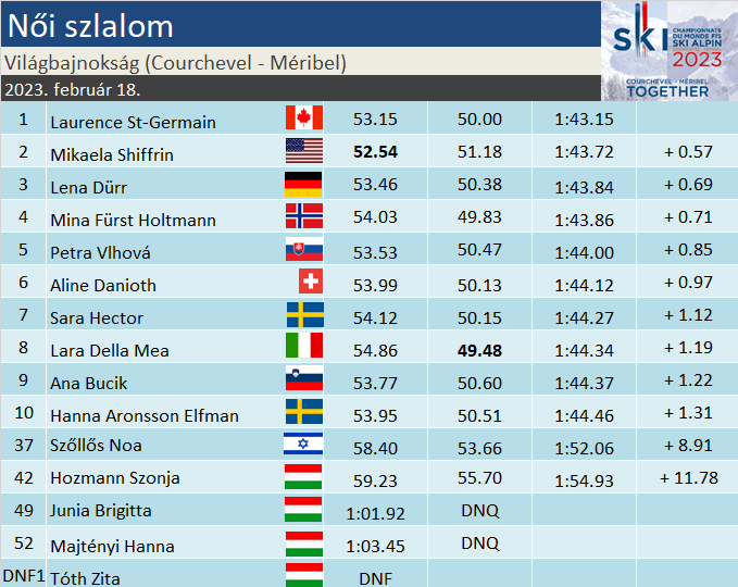 Wendy Holdener még erre is rábírt tenni egy lapáttal. Láthatóan nem a kanadaival foglalkozott, hanem a kínálkozó világbajnoki címmel. A pálya feléig növelte előnyét, utána viszont jött a hiba – kapura lépett és kiesett. Mikaela Shiffrin (2.) a pálya tetején rendkívül darabosan síelt, hattizedes előnye egy csapásra eltűnt. Ugyan a második szektorra még megállította az előny csökkenését, de a folytatásra sem láthattuk azt a könnyed eleganciát, amit megszokhattunk. Ezúttal a nagy hajrá is elmaradt, újabb hibákkal végül a második helyre szorult vissza – ezzel pedig hihetetlen bravúr született. Kanadai világbajnoka lett a női műlesiklásnak!