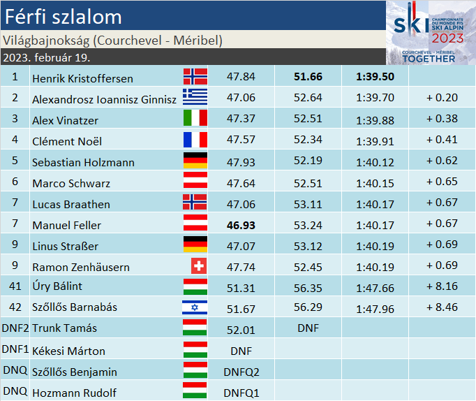 Hihetetlenül fordulatos végjátékot hozott a férfi szlalom második futama. A szoros első futam, és a romló pálya révén nagyon felfordult az eredménylista. Henrik Kristoffersen a 16. helyről rajtolva, a legjobb délutáni futammal lett világbajnok. Az első futam legjobbjai közül Straßer, Braathen és a vezető Feller is sokat estek vissza, nem így AJ Ginnis! A görög rendkívül nagyot hajrázott a pálya végén,, így megszerezte a görög sísport első világbajnoki érmét. Alex Vinatzer 3 helyet javítva szerzett bronzérmet. A legjobb hazai, Noël a 4., Schwarz pedig a lesiklás, a kombináció és az óriás után újabb számban lett a legjobb osztrák, míg a csapatszinten nagy esélyes svájciak szintén leszerepeltek, Zenhäusern csak a 9. lett. Úry Bálint a 41., Szőllős Barnabás a 42. helyen végeztek.