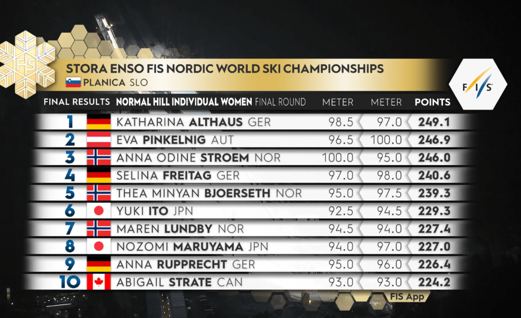 A síugrók számára a női normálsánc egyéni versennyel kezdődött meg az idei északi sí világbajnokság Planicán, az első aranyérmet pedig a versenyszám hagyományaihaoz hűen nagy izgalmak után Katharina Althaus teheti majd el otthon a vitrinbe. Az eszüst Eva Pinkelnig, a bronz Anna Odine Strøm nyakába került.