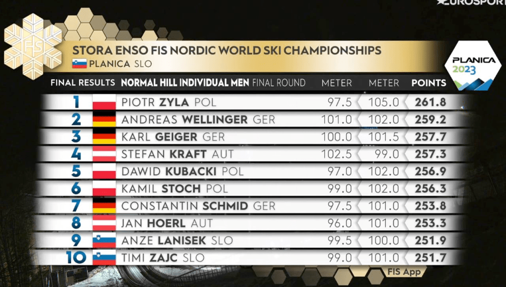 A nők után szombat délután a férfiak számára is megrendezték az első éremosztó számot a planicai északi sí világbajnokságon, ahol a kicsi (pardon, normál-)sánc és a változékony körülmények kombinációja igencsak érdekes versenyt eredményezett, ahol az első kör után mindössze 13.(!) Piotr Zyla ünnepelhetett végül győztesként, megvédve ezzel 2021-ben oberstdorfban megszerzett címét. Az ezüst Andreas Wellingeré, a bronzérem pedig Karl Geigeré lett.