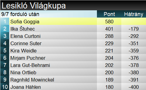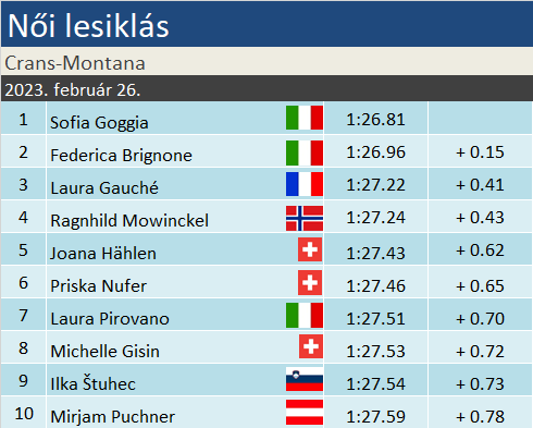 Sofia Goggia a dicstelen világbajnokság után elhallgattatta a kétkedőket, behúzta karrierje 22. Világkupa-győzelmét, amivel megelőzte Federica Brignonét az olasz örökranglista élén. Goggia ötödik lesikló sikerét aratta idén, amivel gyakorlatilag bebiztosította zsinórban harmadik, összességében a negyedik szakági elsőségét. Ami Federicát illeti, több mint három év elteltével zárt újra dobogón a királyszámban. Karrierje során ez az ötödik ilyen alkalom. Laura Gauché vette magára az obligát meglepetésember szerepkörét. Hatodszor végzett a TOP10-ben, legjobb eredménye egy ötödik hely volt eddig: tavaly januárban Zauchensee-n érte azt el Szuper-G-ben. A mögötte hagyott egyéves periódus azért igazolja, karrierje felfelé ívelőben van. Nem mellékesen jó régen, szinte napra pontosan 10 éve állt legutóbb francia lesikló VK-dobogóra: Méribelben Marie Marchand-Arvier mondhatta ezt el magáról.