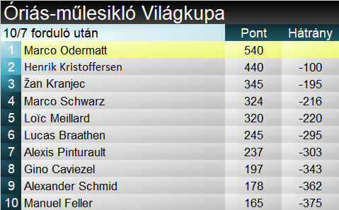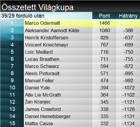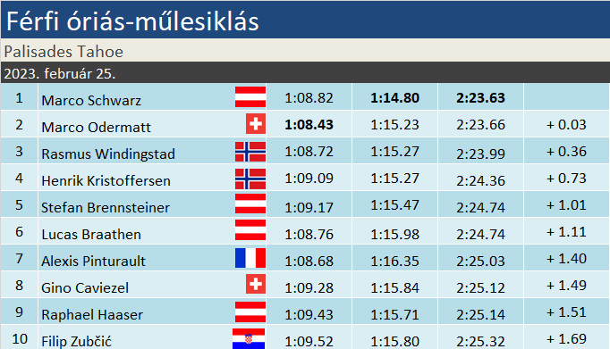Marco Schwarz nagy ígéretnek indult, a szakma benne látta Marcel Hirscher örökösét. A „Blacky” becenévre hallgató sportoló ma már 27 esztendős, de még csak öt Világkupa-sikernél tart. Legutóbb két éve a schladmingi szlalomon jött össze neki az elsőség, már ami a versenysorozatot illeti, hiszen vb-kről hét érmet csak zsebre vágott ez idő alatt. Óriás-műlesiklásban sosem nyert korábban, eddig három bronza volt – ebből két világbajnokságról. Az osztrákok Marcel Hirscher 2019 januári adelbodeni sikere óta vártak az újabb GS-skalpra. Marco Odermatt 23. alkalommal zárt dobogón óriásban, ezzel 100 pontra növelte előnyét a szakágiban Kristoffersennel szemben. Rasmus Windingstad harmadik egyéni VK-pódiumát jegyezte tegnap, 2019 márciusában a Kranjska Gora-i GS-en második, ugyanezen év decemberében az Alta Badia-i parallelen első helye végzett.