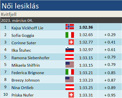 Kajsa Vickhoff Lie karrierje első győzelmével hazai siker született Kvitfjellben, ráadásul első alkalommal végzett első helyen norvég női lesikló a világkupában. Sofia Goggia második helye révén bebiztosította a szakági elsőségét, míg a harmadik helyen Corinne Suter végzett. Mikaela Shiffrin 6. helyével, és azzal, hogy Gut-Behrami előtt végzett, matematikailag is megnyerte a 2022-2023-as Alpesi Sí Világkupa összetettjét.
