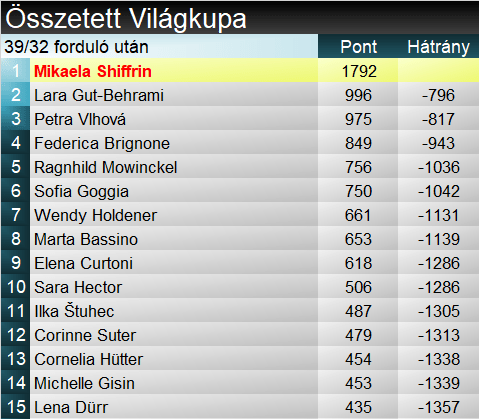 Sofia Gogga ma dobogójával bebiztosította a szakági elsőségért járó kis kristálygömböt, amit majd Andorrában vehet át. Ilka Štuhecet már szintén nem tudják letaszítani a második helyről, a harmadikért viszont Curtoni és Suter még összecsaphatnak. Összetettben pedig Mikaela Shiffrin pedig 700 pont felett tartotta előnyét a második helyezett Gut-Behramival szemben, így az amerikai immár matematikailag is magáénak tudhatja karrierje 5. nagy kristálygömbjét. Az örökranglistán, e tekintetben, már csak Annamarie Moser-Pröll van előtte, 6 sikerrel.
