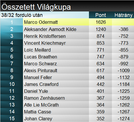 James Crawford (9.) veretes kezdés után közel volt a svájcihoz egészen addig, míg egyetlen benézett kanyarral jókora teret, s így sebességet nem vesztett. Onnantól beszedett nyolc tizedet, nem volt miről beszélni. Még Alexis Pinturault (9.) is kisíelte a szokásos előnyt odafent, ám egy kiszélesített balossal sokat elad a harmadik szektorban. Végül Crawforddal századra azonos idővel végzett – dobogón kívül. Aleksander Aamodt Kilde (3.) nyilván pontosan tisztában volt a realitással, ennek jegyében iszonyatosan odapakolta a nyitószektort. 48 százados előnynél a kritikus balos nem sikerült optimálisra, majd Crawford után ő is rontott ugyanott, így mintegy háromtizedes hátrány lett a vége. Vagyis Babinskyt azért letaszította a dobogóról, ám ezzel együtt biztossá vált Odermatt szakági győzelme.