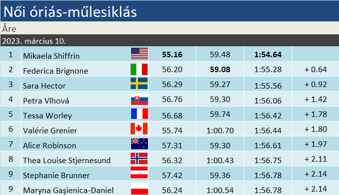 Federica Brignone a 29., míg Sara Hector a 13. dobogóját szerezte óriás-műlesiklásban. Mindketten harcban vannak a szakági pódiumért. Jobb híján, mivel Shiffrin bebiztosította újabb kis kristálygömbjét. GS-ben korábban egyszer, 2019-ben húzta be a szezont. Egészen döbbenetes az idei dominanciája: az utóbbi nyolc versenyből (a vb-t is beleértve) hetet megnyert.