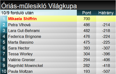 Eljött a nagy nap: beérte Mikaela Shiffrin a svéd legenda, Ingemar Stenmark utolérhetetlennek vélt rekordját, megszerezte 86. Világkupa-győzelmét. Hab a tortán: a rekordbeállításhoz szakági kristálygömb párosult, Gut-Behrami kiesésével biztossá tette elsőségét óriás-műlesiklásban. Impozáns dobogó állt elő, hiszen a világbajnoknő mellé a vb-ezüstérmes Federica Brignone és az olimpiai bajnok Sara Hector állhatott fel.