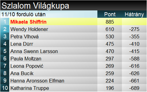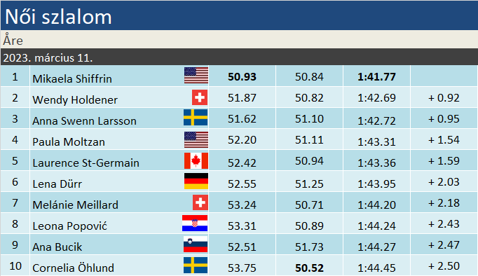 Egy nappal azután, hogy beérte, ma megdöntötte Ingemar Stenmark VK-győzelmi rekordját az amerikai kiválóság. Mikaela Shiffrin tükörsimán nyerte az Åre-i szlalomot, ezzel kétezer pont fölé tornázva szezonteljesítményét. A dobogóra még Wendy Holdener és Anna Swenn-Larsson állhatott fel, miközben az osztrákok gyengélkedése nem akar abbamaradni: Truppe 17. helye volt ma a csúcs. Laurence St-Germain igazolta, egészen jó formának örvend, s nem csak a vébé erejéig vált belőle élsíző. 5. helyen zárt, ez eddigi legjobb szereplése a VK-ban.