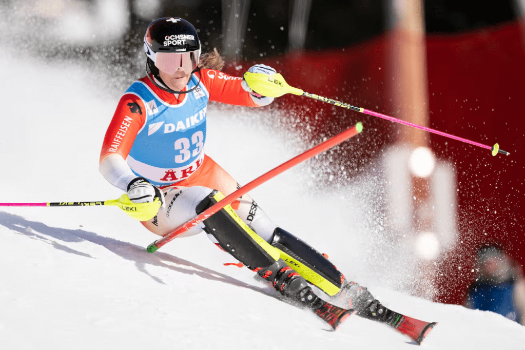 Katharina Liensberger (27.) bizonytalanul, álmatagon haladt lejtmenet, úgy kapott majdnem 3 s-et, hogy látható hibát nem követett el. Sara Hector (9.) a stangliktól távol, szemre jó ritmikával síelt. A megtett több méter azért jelentkezett időhátrányában. Franziska Gritsch hamar kapura lépett, mentségére legyen szólva, hogy nála legalább látszik az önbizalom jele az osztrákoknál. A szám friss világbajnoka, Laurence St-Germain (6.) a maga tempójában tisztesen lehozta a pályát, a beszedett másfél másodperchez hízelgő helyezés párosult. Zrinka Ljutić ismét elment a falig, ami a rizikót illeti. S megint nem fejezte be… A letöréseknél rendre megbillent, a rendkívül sűrű alsó fertályon teljesen belebonyolódott a stanglirengetegbe, mire elvesztette a kontaktot a hóval. Leona Popović (16.) súlypontja hasonlóan hátra került a sűrűbb részen, de ő menteni tudott, még ha ez – a túlkoordinált meredekkel karöltve – nem is ért jó pozíciót délutánra. Ami a horvátnál még ritkán működik, arra Hanna Aronsson Elfman (4.) remekül ráérzett. Gondolunk itt az optimálisan erős tempóra. Egyszerre volt kellően gyors, s egyszerre nem csapott át zaklatottba. Úgy festett, ma ő is dobogóért küzdhet. Katharina Truppe (13.) középszerűen ment, így is jócskán megverte Liensbergert.