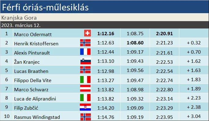 A szombatihoz egészen hasonló versenyt láthattunk vasárnap is Kranjska Gorán, ami a dobogót illeti. Ezúttal is hatalmas menettel szorongatták az első futamot nyerő Marco Odermattot, aki ismét lenullázta hozott előnyét, de végül mégis győzni tudott. A különbség, hogy a svájcit ezúttal Henrik Kristoffersen szorongatta a délután legjobb sízésével, míg Alexis Pinturault-nak be kellett érnie a harmadik hellyel. A legjobb három ismét kiemelkedett a mezőnyből, ami azt jelentette, hogy Žan Kranjec továbbra sem tud dobogóra állni hazai havon. Braathen, és a karrierje eddigi legjobbját elérő Filippo della Vite tette teljessé a legjobb 6 mezőnyét.