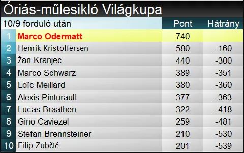 Marco Odermatt megszerezte 22. sikerét, aminek pontosan fele származik az idei szezonból. Ami az óriást illet, idén hatodszor győzött, és a schladmingi kihagyott versenyt leszámítva minden állomáson dobogón végzett – így nemcsoda, hogy már 1 versennyel a vége előtt elhódította a szakági elsőséget. Henrik Kristoffersen negyedszer végzett idén a második helyen óriásban, de nyerni még továbbra sem sikerült. Összeségében 30. alkalommal végzett a szakágban dobogón. Alexis Pinturault a szakágban 41., összességében 76. dobogóját ünnepelte.
