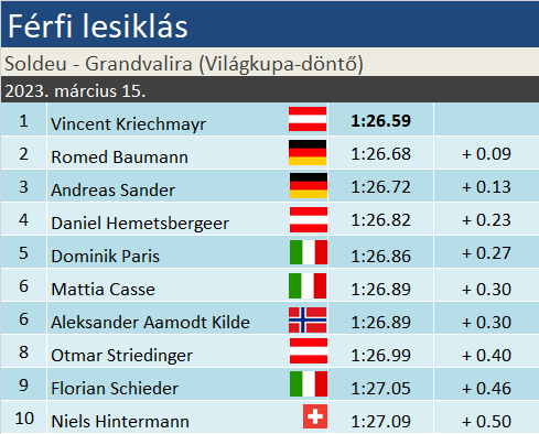 Vincent Kriechmayr egyértelműen a hátán cipelte idén a teljes osztrák alpesi sízést. Az osztrák idei negyedik lesiklását nyerte, összességében pedig a kilencediket. A lassabik szakágat is figyelembe véve a mai 16. sikere a világkupában. Egyértelműen a szezon másodikszámú lesiklója volt Kilde mögött. A norvég 6 sikere mellett csak a linzi síző tudott nyerni idén a királykategóriában. Romed Baumann 11. alkalommal állt dobogóra, de 2019-es országváltása óta a mai volt az első alkalom. Utoljára 8 éve zárt a legjobb 3-ban, ha a cortinai ezüstöt nem számoljuk. Szuper-kombinációból volt már két győzelme, de lesiklásban továbbra is első sikerét üldözi, ötödik alkalommal végzett ebben a számban a második helyen. Andreas Sander nagyjából egy évtizedet várt az első VK-dobogójára, most viszont az aspeni szuperóriás második hely után rögtön bezsebelt egy lesikló dobogót is.