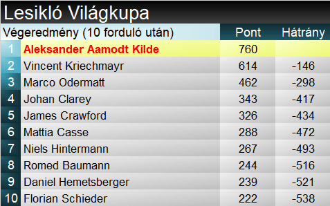 Aleksander Aamodt Kilde 10-ből 6 lesiklást megnyerve, két további dobogót szerezve nyerte meg a szakági világkupát. A norvég karrierje 4. kis kristálygömbjét nyerte meg idén. Lesiklásban a tavalyi év után tudott kiemelkedőt nyújtva duplázni. Mögötte Vincent Kriechmayr végzett a második helyen, aki a másik négy lesiklást tudta bezsebelni a mögöttünk álló télen. Marco Odermatt épp a pontszerző zónában végzett, de szakági harmadik helye nem forgott veszélyben. Clarey Crawford előtt végzett ma, így karrierje eddigi legjobb szakági helyezését megismételve, a 4. helyen búcsúzik a világkupától. Az összetettben a helyzet változatlan, bár Kriechmayr zárkózott Kristoffersenre.