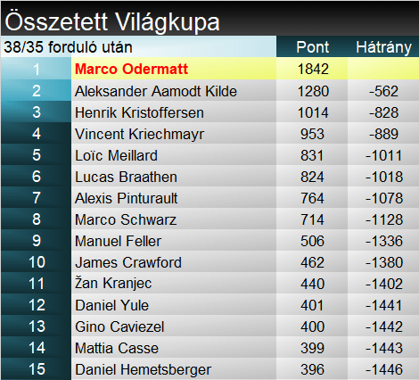 James Crawford (13.) fent igen lassan kezdett – kezdhettünk gyanakodni, hogy ott egyébként talán megolvadt valamennyire a pálya. Marco Odermatt (15.) szintén rendkívül lassan kezdett, ráadásul a kanyargósabb szektorokban is többször mélyre került. Ugyan a négyes szektorban ő kapott a legkevesebbet Kriechmayrtől, ez sem volt komoly szépségtapasz. Következett a menet, amire talán mindenki várt ma: Johan Clarey (12.). A francia gyönyörű íveket síelt a pálya felső részén, az ominózus szektor előtt még vezetett is. Ott viszont azért neki is meggyűlt a baja a kanyarokkal, így a tündérmesére nem volt esély. 72 százados hátránnyal, 19 évvel első pontszerzése után ért utoljára célba a francia klasszis, most is pontszerzőként.