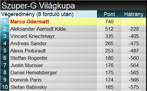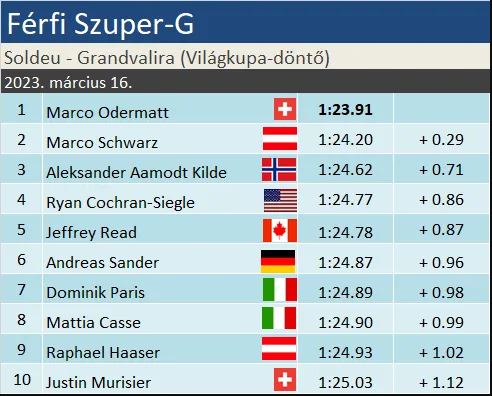 Marco Odermatt stílusosan zárta az évet a szakágban. Az egész évet uralva, 8-ból 6 versenyt nyerve, további két dobogóval végzett a tabella csúcsán, több mint 200 ponttal megelőzve a szakági címvédő Kildét. A svájci hivatalosan második kis kristálygömbjét emelhette a magasba (a harmadikat holnapután fogja), szuper-G-ben ráadásul zsinórban két szakági második helyet követően. Ahogy az már a verseny előtt tudható volt, Kilde végzett a tabella második, Kriechmayr a harmadik helyén. Összetettben Odermatt 1942 pontnál jár, azaz ha szombaton dobogón végez, mindenképp megdönti Hermann Maier 1999-2000-es szezonban felállított 2000 pontos VK-rekordját.