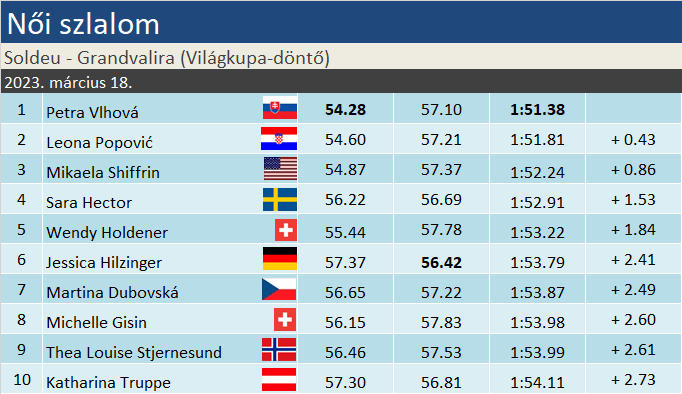 Petra Vlhová 28. alkalommal győzött a Világkupában, ebből egy híján húszat szlalomban szerzett meg. Élete egyik leggyengébb szezonját legalább győzelemmel zárta, a Flachaut követő másodikkal. Leona Popović rendkívül rászolgált erre a dobogóra. A nyolc évvel ezelőtti EYOF-győztes horvát lány a tavalyi zágrábi verseny óta ma tizedik alkalommal végzett a TOP10 között, nem véletlenül került a ranglista legjobbjai közé. Robbanásszerű fejlődésében bizonyára nagy szerepet kapott a kroátok szupertehetségének, Zrinka Ljutićnak, aki egyébként szintén szerzett dobogót idén.