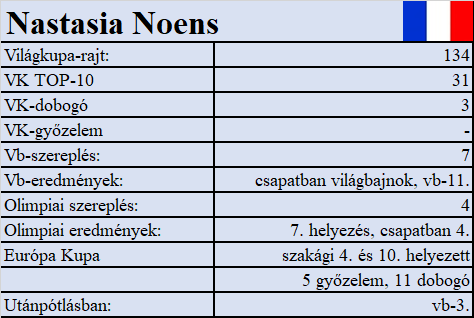Igencsak híján van a francia alpesi sízés klasszis műlesiklókkal, s a női válogatottat elnézve potens technikai sízőt is nehéz találni. Worley mellett Noens visszavonulása is érzékeny veszteség, hiszen bár a legjobbakkal évek óta képtelen volt felvenni a versenyt, az utolsó csúszásáig fix-pontszerzőnek számított.