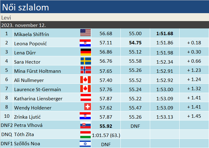 Drámai végkifejletet hozott a nők második levi szlalomja. Az addig toronymagasan vezető, messze a legjobb formának örvendő Petra Vlhová túlvállalta magát és hibázott a letörésnél, ezzel a (hetedik) lappföldi győzelmét átadta Mikaela Shiffrinnek. Az amerikai klasszis szemlátomást sokat tanult tegnapi hibáiból, de a szlováktól ezzel együtt kétfutamos viszonylatban másodpercet meghaladó hátrányban volt, van tehát honnan felzárkóznia. Leona Popović a legjobb délutáni futammal mintegy két tizedre maradt le élete első VK-sikeréről, míg Lena Dürr szombat után újra a dobogón ünnepelhetett. Hector és Nullmeyer ismételten remekelt, kettejük közé Holtmann fért be az 5. helyre. Holdener változatlanul nem túl acélos, ezúttal a 8. helyen végzett a szombati kiváló szereplése után ma délelőtt megint gyengélkedő Liensbergerrel holtversenyben. A két magyar lány közül vasárnap Tóth Zita (63.) ért célba, míg az izraeli színekben versenyző Szőllős Noa a meredek elején búcsúzott.