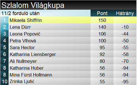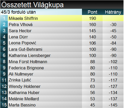 Némi szerencsével ugyan, de megszerezte hetedik győzelmét Leviben, ezzel együtt Mikaela Shiffrin nevére írják az újabb lappföldi rénszarvast. Az amerikai 89. sikerét aratta a Világkupában, ebből az 54-diket szlalomban. (Aki most jött volna ki a barlangból, megüzenjük, hogy mindkettő örökös rekordnak számít.) Átvette ugyan a vezetést mind a szakági, mind az összetett pontversenyben, ám az kijelenthető, hogy több kell tőle ahhoz, hogy ott is maradjon. Leona Popović másodjára végzett dobogós helyen a Világkupában, az előző idényzárón, Soldeun éppúgy másodikként zárt. Érik már az újabb horvát VK-futamgyőzelem, s elképzelhető, hogy ezt nem a szupertehetséges Ljutić fogja prezentálni. Lena Dürr pedig szép lassan akár még a kristálygömbért folyó küzdelembe is beleszólhat. Nem nagyon tud hibázni, szombat után ismét dobogóra állt – karrierje során tízedik alkalommal (régi parallelsikerén kívül).