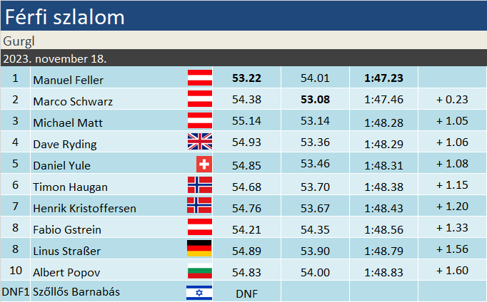 Tizenhét versenyen át tartó nyeretlenségi sorozatot zártak le ma az osztrák szlalomosok. Nem is akárhogyan, rögtön hármas dobogóval, amire 8 éve nem volt precedens a Világkupában. Manuel Feller alapvetően délelőtt alapozta meg sikerét, Marco Schwarz pedig főként délután mutatta meg, nem a levegőbe beszélt, amikor az összetett elhódításáról álmodozott. A dobogó harmadik fokára egy gyötrelmes időszakot lezárva Michael Matt állhatott fel, egyetlen századdal megelőzve Gurgl nem-hivatalos díszpolgárát, Dave Rydingot. Az egyébként izgalmas versenyt klímaaktivisták zavarkeltése akasztott meg, tett majdnem tönkre. Szőllős Barnabás az első futamban nem ért célba.