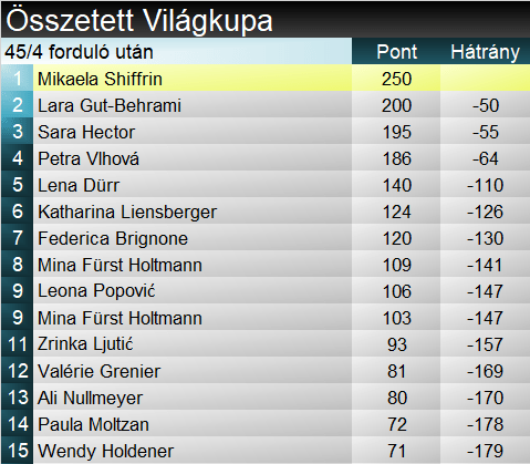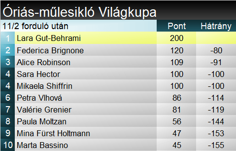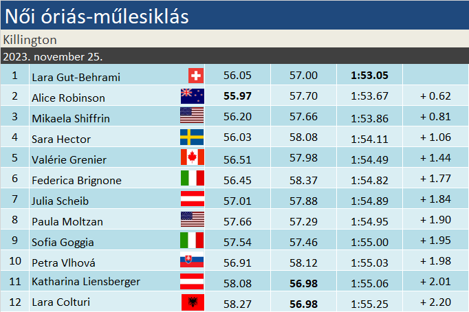 Lara Gut-Behrami 39. ízben győzedelmeskedett a Világkupában, ebből a hetediket gyűjtötte be óriás-műlesiklásban. Ha így halad, nem kell sokat várni, hogy beérje Anja Pärsont a női lista hatodik helyén. Alice Robinson hatodik, míg a szakági címvédő Mikaela Shiffrin 39. dobogós helyét szerezte óriásban. Az új-zélandi legutóbb a 2021-es lenzerheidei VK-döntőn aratott sikerekor ízlelhette meg ezt az érzést, azóta volt, hogy a legjobb tizenötből is kicsúszott a ranglistán.