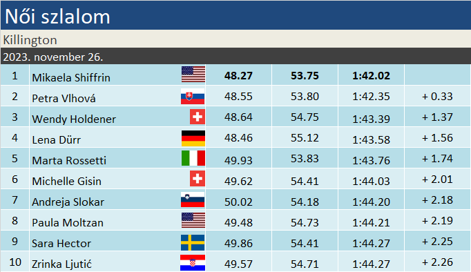 Továbbra is igaz a sorminta, ha Killingtonban Shiffrin nyer, akkor egy szlovák mögötte a második. Velez-Zuzulová mindezt egyszer, Petra Vlhová ötször tette igazzá. Vlhová 69. alkalommal végzett VK-dobogón, 42. alkalommal legsikeresebb számában. A mai volt Wendy Holdener 35. dobogója szlalomban, míg a 49., ha minden számot tekintünk.