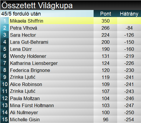 Shiffrin lépéselőnyre tett szert az összetettben Vlhovával szemben, előnye jelenleg 84 pont. Mögéjük Hector zárkózott fel a 3. helyre, míg Gut-Behrami a 4. helyre csúszott vissza. A szakági pontversenyben szintén lélegzetvételnyi előnyhöz jutott az amerikai, immár 60 pont az előnye Dürrel szemben, míg Vlhová lemaradása 70 pont.