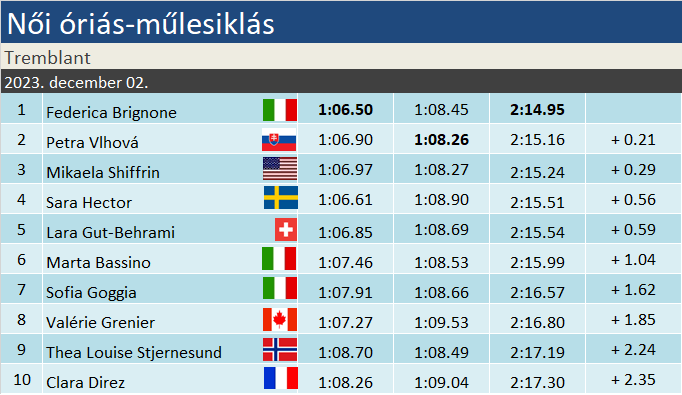 Federica Brignone 22. alkalommal győzött a Világkupában, kilencedjére kiemelt számában, óriásban. Tette mindezt 33 éven túl. Ezzel megdöntötte Anita Wachter korrekordját, mostantól (gyanítjuk, nem sokáig) ő minden idők legrutinosabb óriás-műlesikló VK-futamgyőztese a nőknél. Nem mellékesen egalizálta Sofia Goggiával való különcsatáját az olasz rekordgyőztesi pozícióért, így per pillanat – Carole Merle-lel hármas holtversenyben – ők állnak a rangsor 22. helyén. Petra Vlhová 19., míg Mikaela Shiffrin 40. alkalommal zárt dobogón óriásban.
