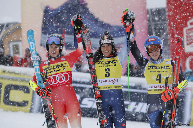 Federica Brignone dacolta legeredményesebben a második futam végére felerősödő hóviharral. Az olasz a 6. helyről, a futam legjobb idejével tört előre és siekrült számára a hétvégi duplázás. Az első futamot nyerő Petra Vlhová a dobogóról is lecsúszott az egyre romló körülmények közt. Lara Gut-Behrami majdnem megőrizte majd’ másodperces előnyét. Végül ugyan az olasztól kikapott, de Shiffrint át tudta ugrania második helyért. A nap meglepetése Clara Direz lett, akit mindössze 6 század választott el a dobogótól.