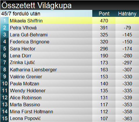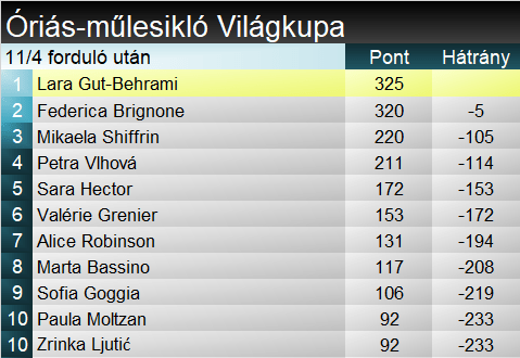A szakági pontverseny élén a két idei kétszeres győztes áll – Gut-Behrami 5 pontot őrzött meg előnyéből a kanadai hétvége végére Brignonéval szemben. Shiffrin és Vlhová lemaradása már 10 pont fölött. Összetettben viszont az utóbbi kettős áll az élen – Shiffrin 79 ponttal előzi Vlhovát. Mögöttük sorakozik az egyre jobb esélyekkel bíró Gut-Behrami és Brignone.