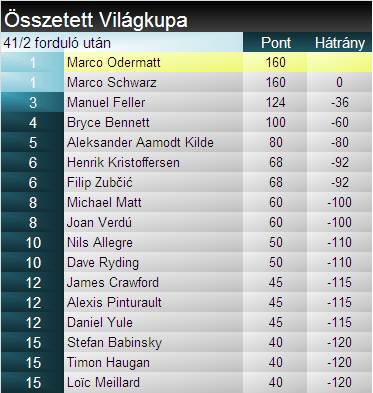 A szakági tabella megegyezik a mai verseny végeredményével. Az összetettben viszont holtversenyben vezet már a címvédő Marco Odermatt és a legnagyobb kihívónak kikiáltott Marco Schwarz. Odermatt egy győzelemmel és egy 3. hellyel szerezte a 160 pontját, míg Schwarz két 2. hellyel, azonban ma pont nélkül maradt az osztrák.