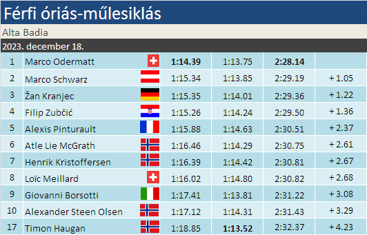 Marco Odermatt zsinórban a 6. megrendezett óriást is megnyerte, a svájci immár 20 verseny óta mindig dobogón állt a szakágban, ha elindult (tavalyi schladmingi vresenytől sérülés miatt maradt távol). Az örökranglistán 27 sikerével otthagyta Klammert és Kostelićet és immár Phil Mahre-ral áll azonos győzelmi számmal. Marco Schwarz 22. alkalommal végzett VK-dobogón. A korábbi speciálszlalomos egyre inkább az egyik elsőszámú tényezővé válik Odermatt mögött óriásban is. Žan Kranjec 13. alkalommal végzett pódiumon, ebből 5-ször Alta Badián, mind az öt alkalommal a 3. helyen.