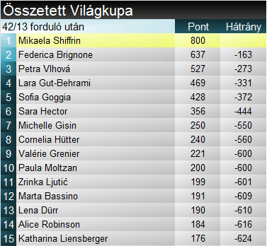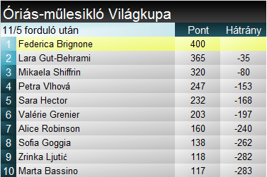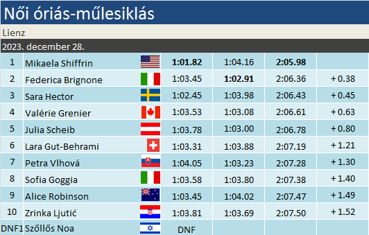 Három harmadik helyezés után csak behúzta első sikerét idén óriás-műlesiklásban Mikaela Shiffrin. Összességében a 22-diknél tart, minden szakágat figyelembe véve pedig 92. VK- futamát nyerte. Negyedszer győzött ezen a télen, a mostani előtt kettőt nyert szlalomban, egyet pedig lesiklásban. Federica Brignone 32. alkalommal végzett dobogón kedvenc szakágában. Idei szereplése elképesztően konzisztens: két első, két második és egy hatodik helyezéssel magától értetődő módon átvette a vezetést a szakági tabellán. A mai Shiffrint elnézve azért még vért kell izzadnia a végső sikerért. Az állítás némi csavarral szintén abszolút helytálló: az eddig látott Brignone képes lehet az amerikai megszorítására összetettben. Sara Hector öröme is érthető volt, elvégre idén először állt dobogón. Összességében a 14-edik pódiumnál tart.