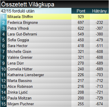 Gut-Behrami ugyan ma megelőzte Brignonét, a szakági világkupában az olasz azonban tartja vezetését, igaz, már csak 15 pont előnye. Shiffrin a mai gyengébb menettel 100 pont fölötti hátrányba került. Összetettben Shiffrin vezetése továbbra is megingathatatlan, 232 ponttal vezet Brignone előtt. Az első hét helyen ma nem történt változás.