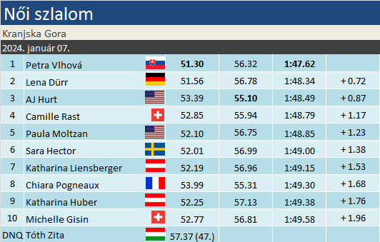 Nehéz körülmények uralkodtak Kranjska Gorán, a teljes verseny alatt hullott csapadék – változó halmazállapotban. Ez mit sem zavarta Petra Vlhovát, aki a körülményekhez képest egészen masszív futamokkal simán behúzta a mai versenyt. Ezzel 5 pontra megközelítette az első futam során búcsúzó Shiffrint a szakágiban. Lena Dürr leginkább délelőttről hozott előnyéből gazdálkodva hozott újabb dobogót. A nap meglepetésembere AJ Hurt volt, aki harminc feletti rajtszám birtokában, a 16. helyről, a legjobb délutáni futammal megszerezte élete első VK- pódiumát. Rast, Moltzan, Hector, Liensberger és a 16 helyet javító Pogneaux végzett még a legjobb nyolc között, míg Popović kiszorult a TOP10-ből. Mögötte két nagy tehetség, Ģērmane és Colturi foglalt helyet, lett, ill. albán csúccsal. Tóth Zita a 47. helyen fejezte be az első futamot.