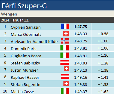 Cyprien Sarrazin karrierje 3. győzelmét szerezte, a 3. különböző szakágban. Szuper-G-ben az eddigi legjobb eredménye a grödeni 4. hely volt. Akkor 9 századdal maradt le a dobogóról. Marco Odermatt az idei három versenyen a dobogó mindhárom fokára felállhatott már. Összességében ez volt a 19. ilyen alkalom a szakágban, a 61 dobogós helyezése közül. Aleksander Aamodt Kilde idén hatodszor, összességében 47. alkalommal állt dobogóra. Wengenben már 7 alkalommal végzett a legjobb háromban.