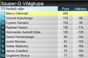 Az idei szezonban egyébként még csak a 3. szuper-G-t rendezték meg ma. A grödeni versenyen osztrák kettős győzelem született, míg az akkori harmadik Odermatt Bormióban győzött, Haaser és Kilde előtt. Mivel a svájci egyedüliként végzett eddig mindkét alkalommal dobogón, így természetesen vezette a verseny előtt a szakági világkupát (is).