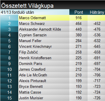 A szakági világkupában Odermatt növelte előnyét Kriechmayrrel szemben, míg Sarrazin 100 ponton belülre zárkózott a svájcihoz képest. Kilde lemaradása már 120 pont. Összetettben természetesen Odermatt helye nem kérdés, Kildének viszont a holnapi nap már egy gyengébb eredmény is esélyt adhat arra, hogy átvegye a 2. helyet Schwarztól, hacsaknem Sarrazin lep meg ismét mindenkit…