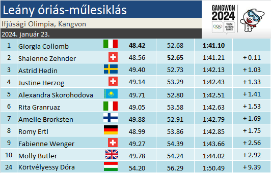 Giorgia Collomb szűken, egyetlen tizeddel győzedelmeskedett óriás-műlesiklásban, az olasz mellett a svájci Shaienne Zehnder, valamint (már másodpercen túli elmaradással) a svéd Astrid Hedin állhatott még fel a dobogóra. Az eddig remekül szereplő osztrákok mai nullázása felidézte a Világkupában látott vesszőfutást. Körtvélyessy Dóra szép helytállásának első lépése az volt, hogy 49-es rajtszámmal a 79 főt számláló mezőnyben – bot nélkül! – becsusszant a TOP30-ba, majd javított még hat pozíciót, így a 24. helyen fejezte be a versenyt. Hátránya 9.39 a győzteshez képest.