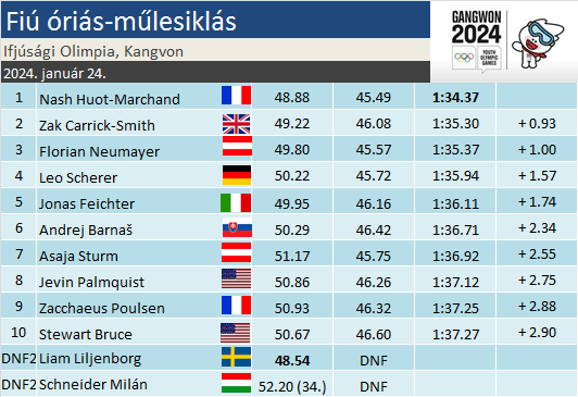Nash Huot-Marchand révén francia győzelem született az Ifjúsági Olimpia óriás-műlesikló számában. Az első futam után még második síző a legjobb délutáni menettel, közel másodperces előny birtokában vitte el az aranyat. Sikeréhez kellett a délelőtti legjobb Liam Liljenborg kiesése is. A gall mögött a kombináció bajnoka, Zak Carrick-Smith végzett, köszönhetően stabilitásának, hiszen egyik futama sem volt érdemes a TOP3-ra. A bronzérem osztrákhoz került, Florian Neumayer a 7. helyről zárkózott egy a győzteshez mérhető délutáni futammal. Elég nagyok voltak egyébiránt a különbségek, 2 s-en belül már csak a német Leo Scherer, valamint a dél-tiroli Jonas Feichter végzett. Az első futam harmadikja, Elliot Westlund szintén búcsúzott, vagyis ez egy eléggé keserű nap lett a svédek számára. A 78 sízőt számláló mezőnyben Schneider Milán délelőtt bő 3 tizeddel lecsúszott a TOP30-ról, a 33. helyről indulva a második futamot pedig sajnos nem tudta befejezni.