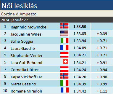 Zaklatott verseny zajlott ma is Cortina d’Ampezzón. Az esések mellett a viharos erejű szél indukált több kényszerszünetet. S ami a tévéközvetítésből kimaradt: fordulat történt az élen! Ragnhild Mowinckel 20-as rajtszámmal 44 századot vert Sofia Goggiára, majd 26-ossal Jacqueline Wiles száguldott be a 2. helyre. A versenyt egészen Goggiáig vezető Laura Gauché lecsúszott a dobogós helyről. Venier és Gut-Behrami párosa áll az 5. helyen. Nagyobb bukások nélkül a mai napot sem úszták meg a lányok: Isabella Wrightot helikopterrel szállították el, de elvileg jól van, Joana Hählen viszont tolószékkel hagyta el a helyszínt. (Azóta kiderült, hogy keresztszalag-szakadást szenvedett.) Utóbb az andorrai Cande Moreno, majd Ania Monica Caill esett a Delta-kanyarban. A román lány horrorbukása után – két sízővel a vége előtt – a versenyirányítás lezárta a napot.