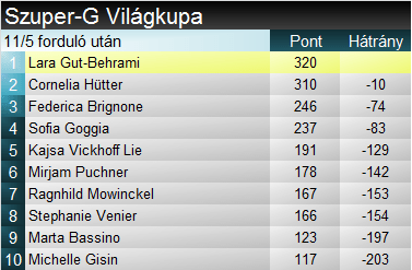 Lara Gut-Behrami a karriertörténeti mérföldkövek után ma megszerezte 41. győzelmét a Világkupában, ebből a 21-diket szuperóriásban. Ezzel egyfelől meghaladta Pirmin Zurbriggent, másrészt egyetlen siker választja el Anja Pärsontól. S csak csendben írjuk, hogy hét SG-siker Lindsey Vonn abszolút rekordjától. A szakági tabellán átvette a vezetést Conny Hüttertől, s ami talán még fontosabb, lerázta magáról a mostanság hullámvölgybe került Fede’ Brignonét.