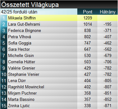 Ami biztosnak látszik, hogy jövő kedden a kronplatzi óriás-műlesiklással folytatják a lányok. Elviekben jövő hétvégén Garmisch-Partenkirchen rendezne a lányoknak, de a folyamatosan 10 fok fölötti hőmérséklet ezt minimum kétségessé teszi. Meglátjuk! Mindenesetre ha cortinai formáját hozza a következő napokban az 1000 pontos határt ma átlépett Gut-Behrami, még akár át is veheti a vezetést összetettben Shiffrintől…