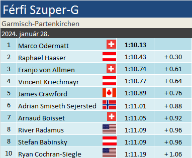 Raphael Haaser harmadik dobogóját, második helyét szerezte a Világkupában. A bormiói Szuper-G után ez volt a második idén, ami remélhetőleg elegendő lesz ahhoz, hogy végre megfelelő sisakszponzort találjon magának. Jó pénzért. Franjo von Allmen a svájci sísport legnagyobb ígérete. Két éve három ezüstérmet szerzett a junior-világbajnokságról, az Európa Kupában pedig tíz TOP10-helyezést, közte egy győzelmet kasszírozott. Ezen a télen berobbant a VK- mezőnybe, Gröden és a tegnapi futam után harmadszor végzett a legjobb tízben.