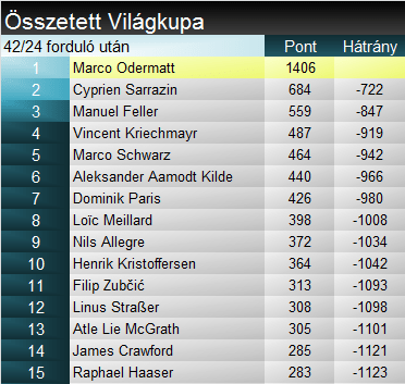 Marco Odermattra már sok-sok dicséretet megfogalmaztunk. Ma újabb mérföldkőhöz érkezett, hiszen 33. Világkupa-győzelmével beérte a legendás Bode Millert, ezzel bekerült a férfi örökranglista TOP10 sízője közé. Pinturault számától még egy siker választja el. A szakági nem kérdés, mert bár a két osztráknak még van matematikai esélye, két futammal a vége előtt száz fölötti pontelőnyről Odermattot nem lehet megelőzni.